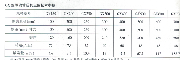 :GX型固定式螺旋輸送機(jī)有七種規(guī)格。螺旋直徑:150、200、250、300、400、500、600;十種標(biāo)準(zhǔn)轉(zhuǎn)數(shù)(數(shù)/分):20、30、35、45、60、75、90、120、150
