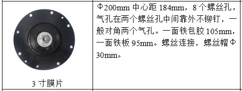 GOYEN-Z-76S脈沖閥膜片尺寸:Φ200mm中心距184mm,8個(gè)螺絲孔,氣孔在兩個(gè)螺絲孔中間靠外不鉚釘,一般對(duì)角兩個(gè)氣孔。一面鐵包膠105mm,一面鐵板95mm。螺絲連接,螺絲帽Φ30mm。